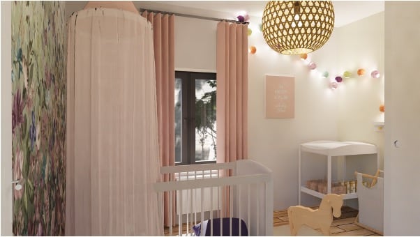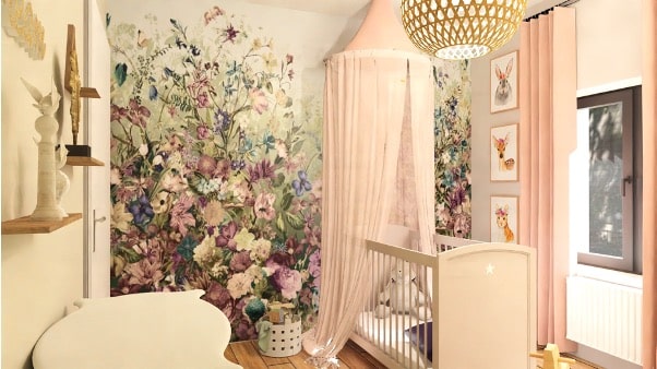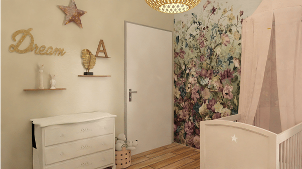J’ai récemment été sollicité par mes clients pour concevoir une nouvelle chambre pour leur deuxième petite fille. Ils aspiraient à créer une atmosphère empreinte de nature, agrémentée d’une délicate touche de féminité. Notre objectif principal était d’intégrer une table à langer tout en préservant le lit déjà en place. Après réflexion, nous avons choisi de mettre en avant un pan de mur en y appliquant un superbe papier peint fleuri, conférant ainsi une note romantique à la pièce. Pour compléter l’ensemble, nous avons décidé d’installer un élégant ciel de lit, créant ainsi un cocon chaleureux et ajoutant de la verticalité à l’espace visuel.